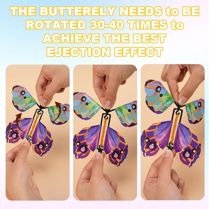 - 【Easy to install】Our surprise gift box is very easy to assemble, after folding the box, you can take out the butterfly props and start to rotate the rubber band, about 35-40 turns (360 rotation is one turn), then put the rotated butterflies into the inner layer of the box (butterfly head facing up). Place the butterflies on all sides and close the lid. When the recipient opens the gift box, several twisted simulation butterflies will fly out and give you a wonderful surprise.