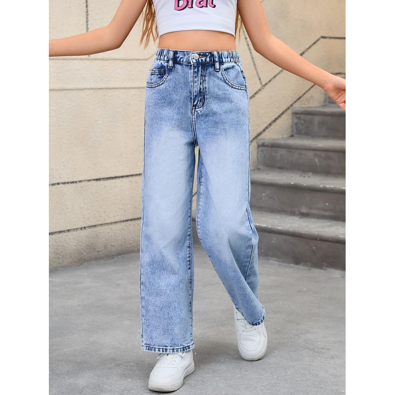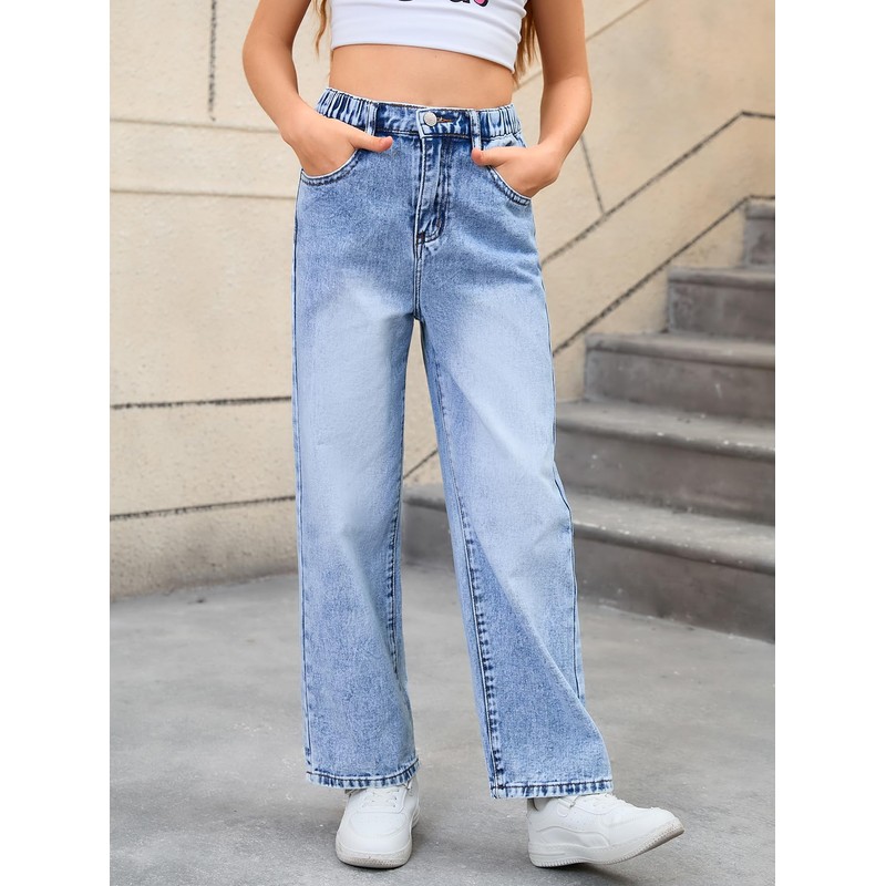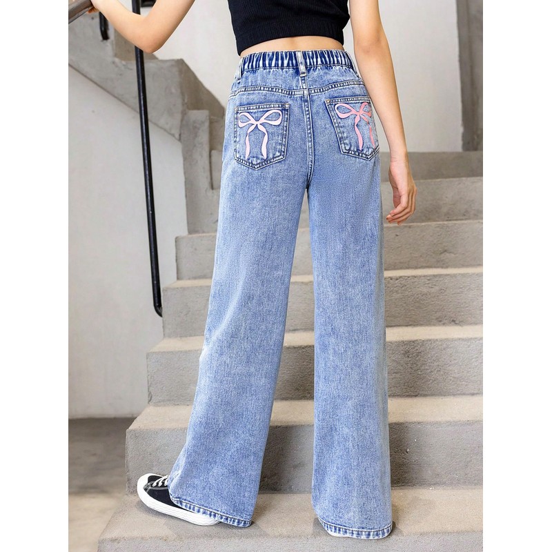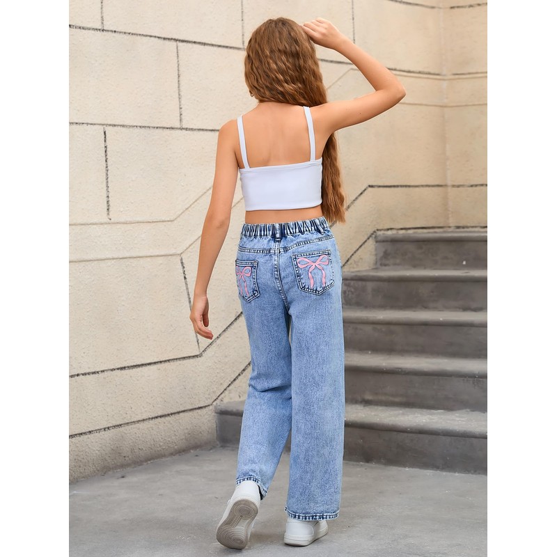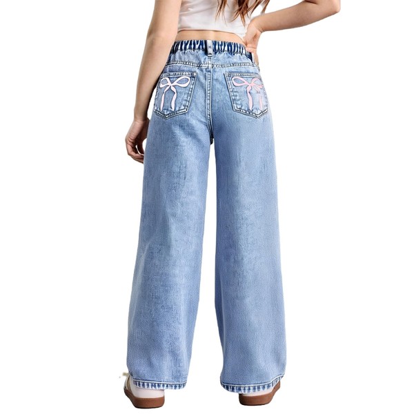 WDIRARA Girl's Bow Print Back Zipper Fly Elastic High Waist Denim Pants Basic Wide Leg Jeans Blue 10Y