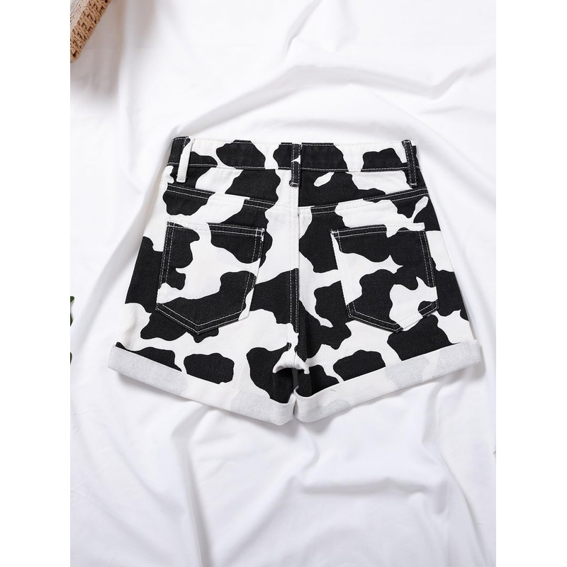 WDIRARA Girl's Cow Print High Waist Button Wide Leg Denim Shorts Casual Shorts Black and White 11Y