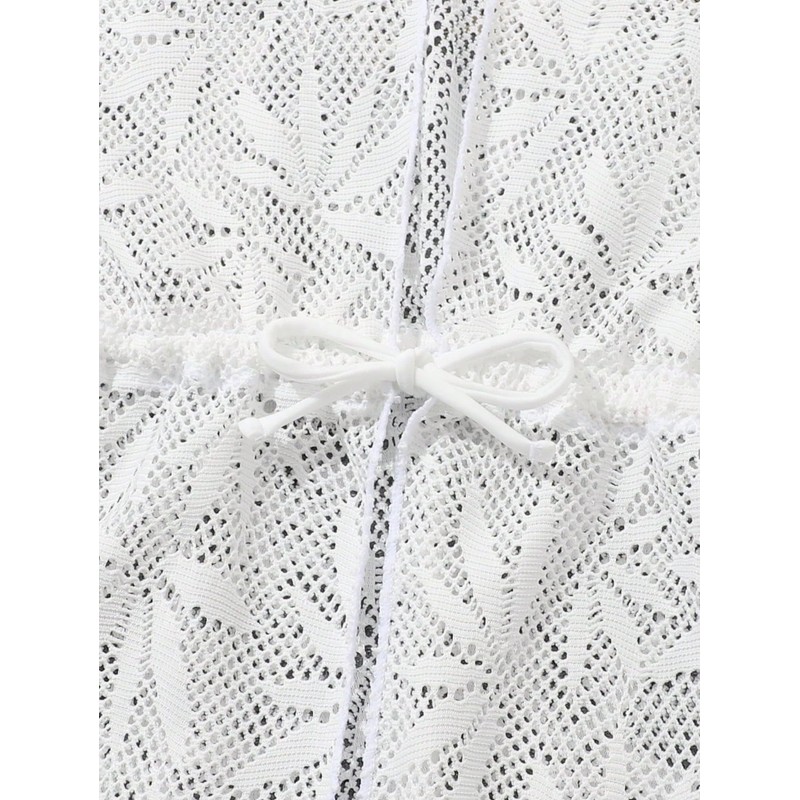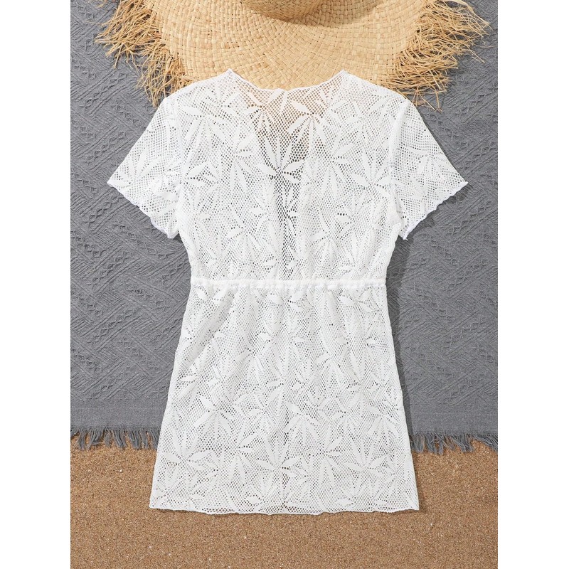 - Features: cover up dress, jacquard bathing suit, mesh, mini dress, short sleeve, scoop neck, lettuce hem, drawstring waist