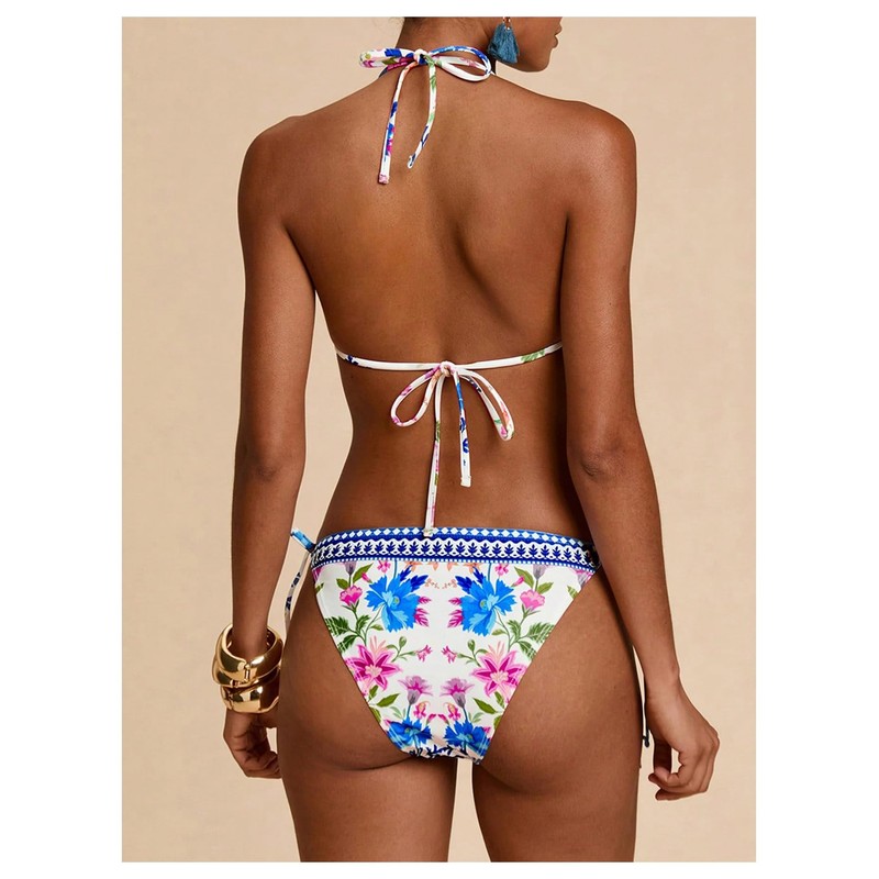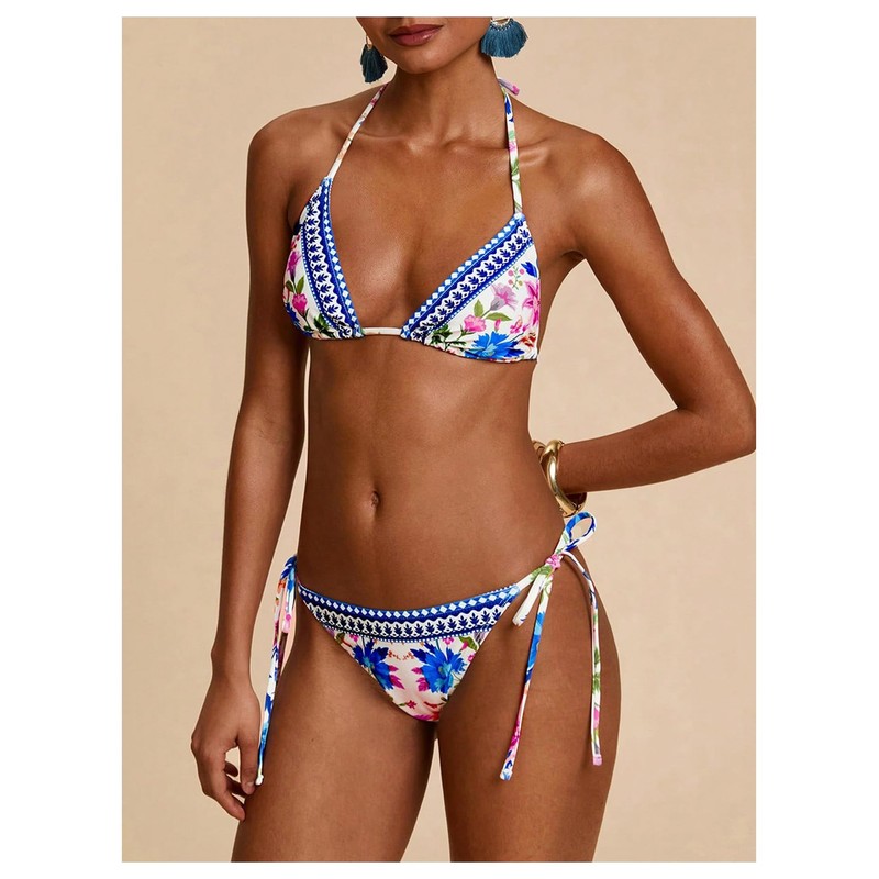- Features: boho, allover print, halter neck, tie back, wireless bra, tie side, 2 piece bikini set