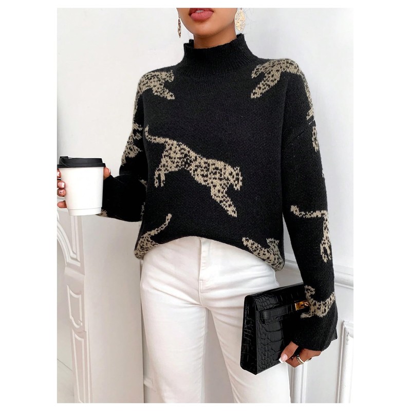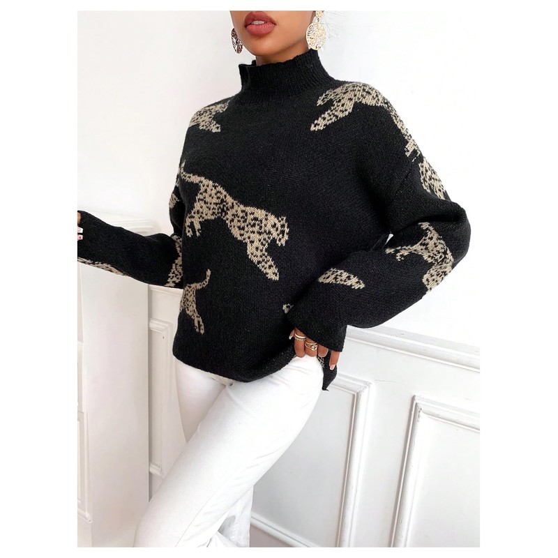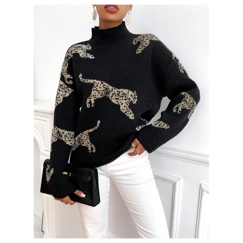- Features: Casual sweater knitwear features with animal leopard pattern, mock neck, long sleeve