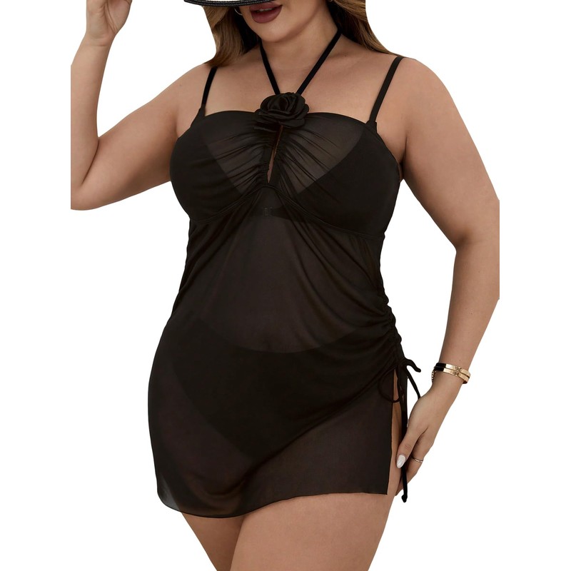 - Feature: Plus size, 3D flower, sheer mesh, drawstring side, slim fit, split hem, solid cover up