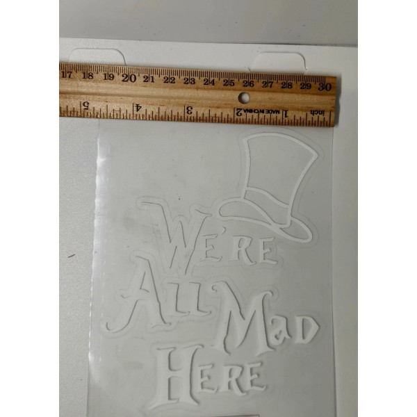 This We're All Mad Here sticker featuring the iconic Mad Hatter saying is perfect for any collector or fan of Alice in Wonderland. The white color of the sticker will match any surface it is placed on. It's a great addition to your collection of automobilia decals and stickers.