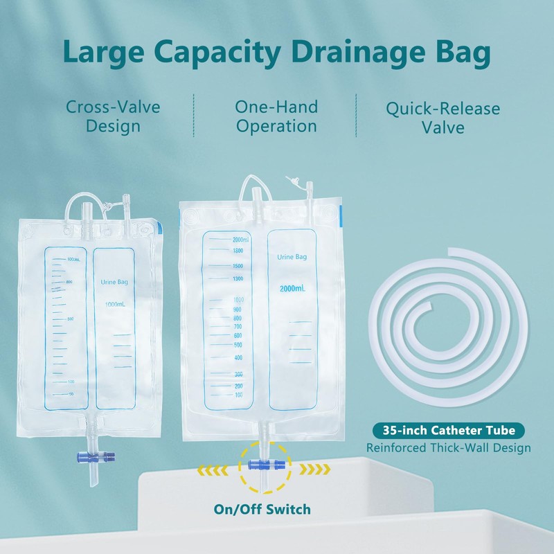 - 【Dual Urine Bags with Drain Valve】 Comes with two urine bags: a large 2000ml bag for nighttime use and a compact 1000ml bag for daytime activities. Both feature a cross-shaped drainage valve for easy and controlled emptying.