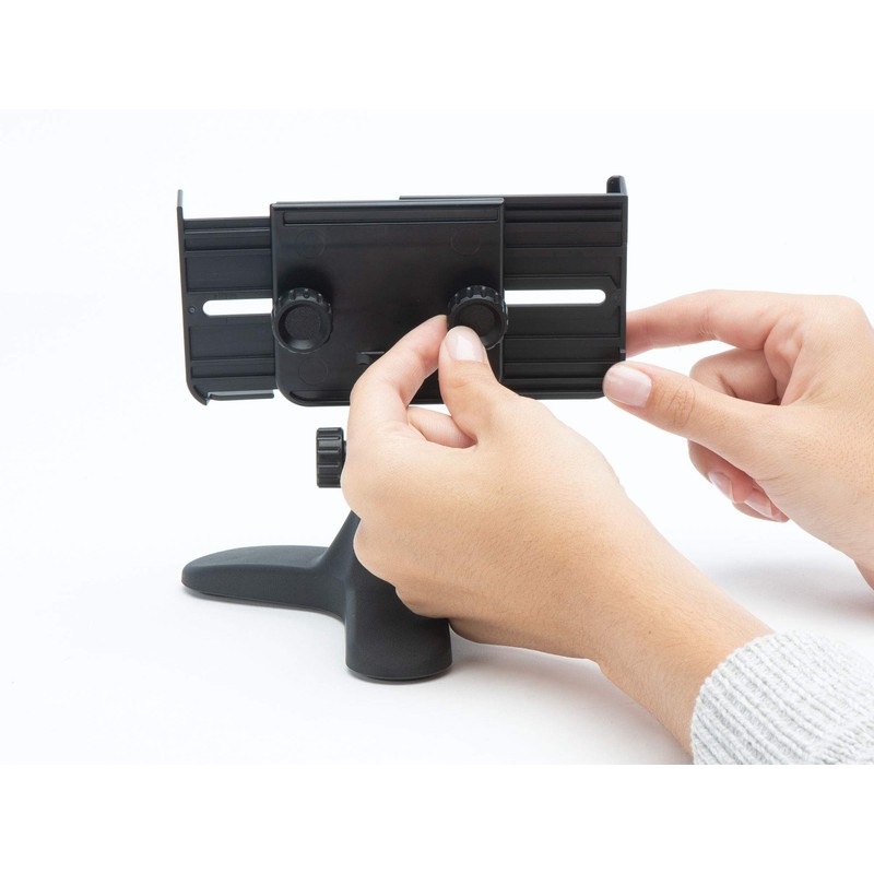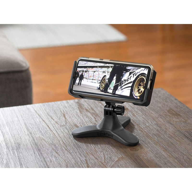 - The DeskFone Two View phone holder fits phones that measure approximately 2⅞” wide when standing vertically, and stretches all the way out to 6¾” to accommodate the horizontal or “landscape” viewing angle.