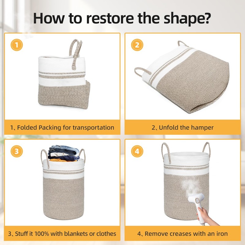 • Simple & Versatile: This laundry hamper not only has a simple and beautiful design, but also has a wide range of uses, which can be used in different scenarios, such as laundry room, bedroom, bathroom, living room, college dormitory, children's room and so on. NOTE: For efficient transportation, the laundry basket is folded. You can fill it with some towels or blankets and it will soon regain its elegant shape, and an iron is a great way to remove creases