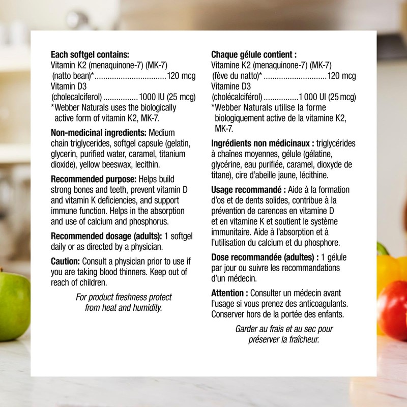 Webber Naturals Vitamin K2 with D3, 60 Softgels, Helps Support Bones, Teeth, and Immune Function, Gluten & Dairy Free