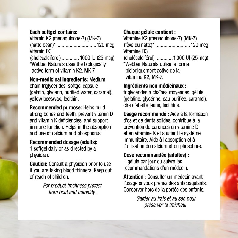 Vitamin K2+D3 from Webber Naturals provides the most biologically active forms of two major fat-soluble vitamins for bone health. Vitamin D3 (cholecalciferol) and vitamin K2 (menaquinone-7 [MK-7]) are highly bioavailable and bioactive forms of these essential nutrients, with vitamin K2 providing 24-hour protection in a single dose. Together, these nutrients help guide calcium away from soft tissues, such as blood vessels, and into the bones and teeth where it is most needed.