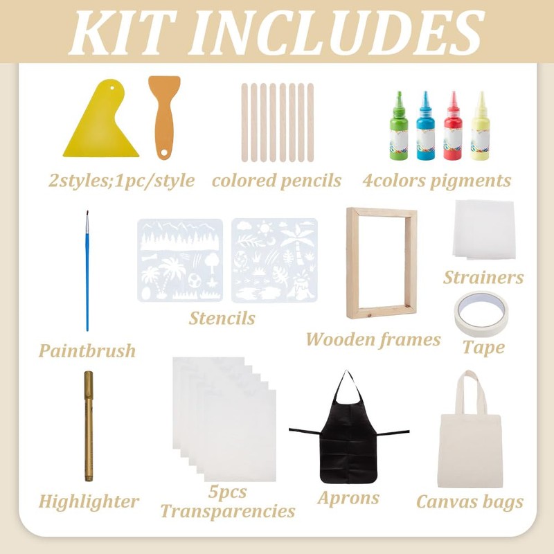 • Value Pack:The package you received contains 1 wood silk screen printing frame,2 beach stencils, 2 squeegees,instructions,5 sheets A4 inkjet transparency film,4 paints,1 paintbrush,1brush,1 bag of wooden sticks,bags,apron and tape