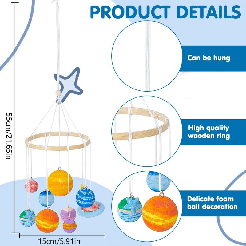 - Easy to assemble: With simple coloring and assemble,you can have your own mini solar system.First color the planets balls,then assemble them with the included claw nails,and finally finish hang them with threads and hoop