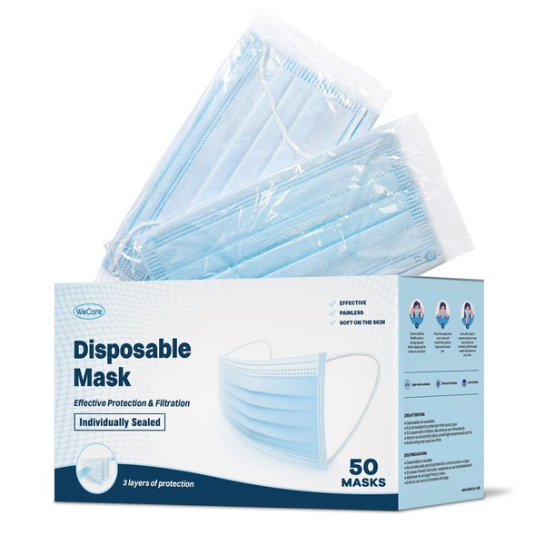 WeCare Disposable Face Mask, 3-Ply with Ear Loop (50 Individually Wrapped), Blue
