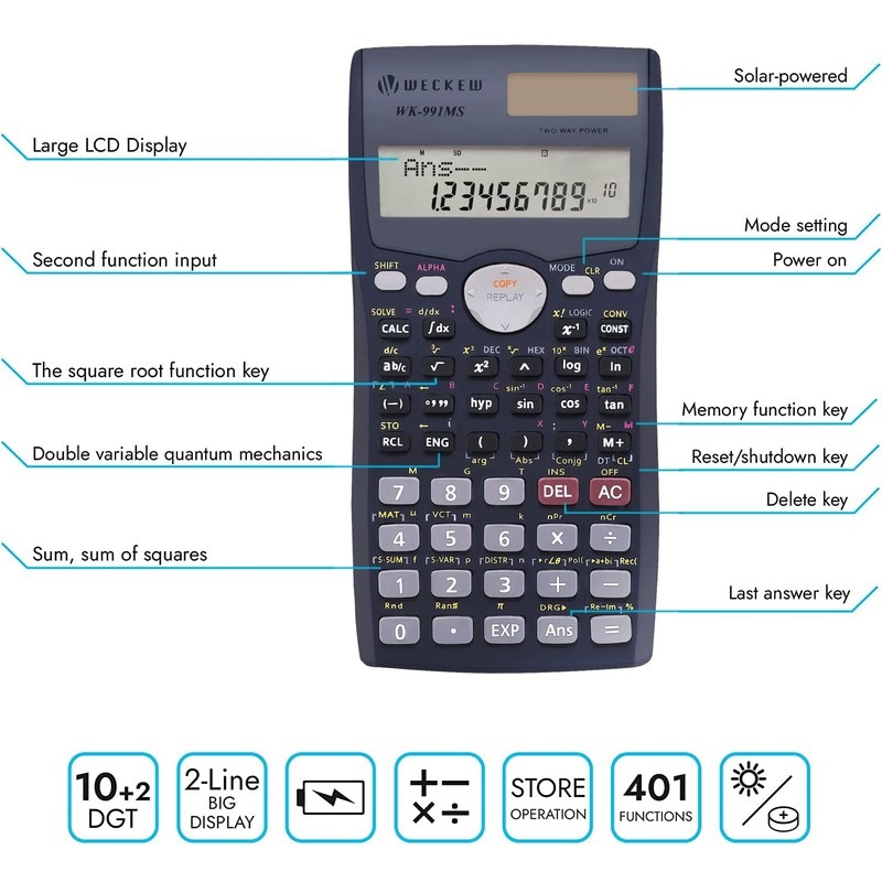WECKEW Scientific Calculator, Engineering Scientific Calculator with Solar Power. 401 Function, 2-Line LCD Display - Suitable for School Students, Teachers and Business Use,Perfect for GCSE