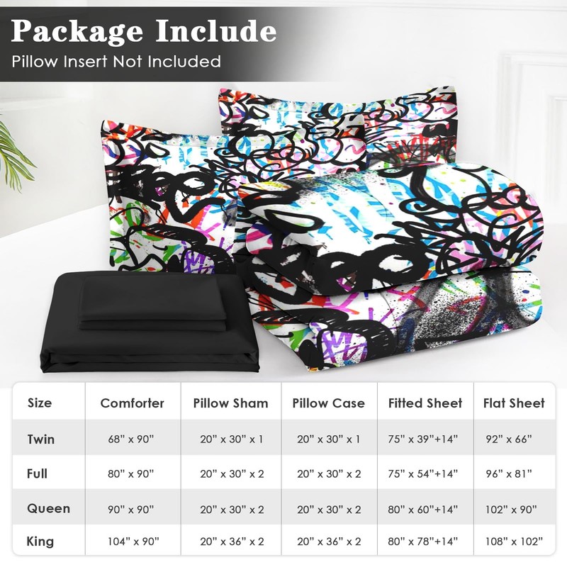 WeCozy 7 Pcs Full Size Comforter Set with 2 Pillowcases & 2 Shams, Urban Skateboard Bedding for Kids and Adults, Music Abstract Graffiti Bed in a Bag with Flat Fitted Sheet
