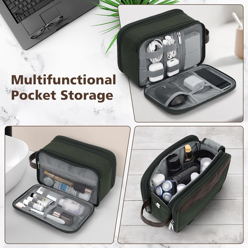 - High Quality Material: The surface of the men's travel toiletry bag is made of 600D Oxford cloth and PU, which is waterproof and dirt-proof. The stitching is woven with high-density double-needle thread to make the toiletry bag more sturdy and solid, increasing its durability. The bag interior is made of polyester, which is waterproof and easy to clean, even in the bathroom. There is no need to worry about getting wet or getting water in.