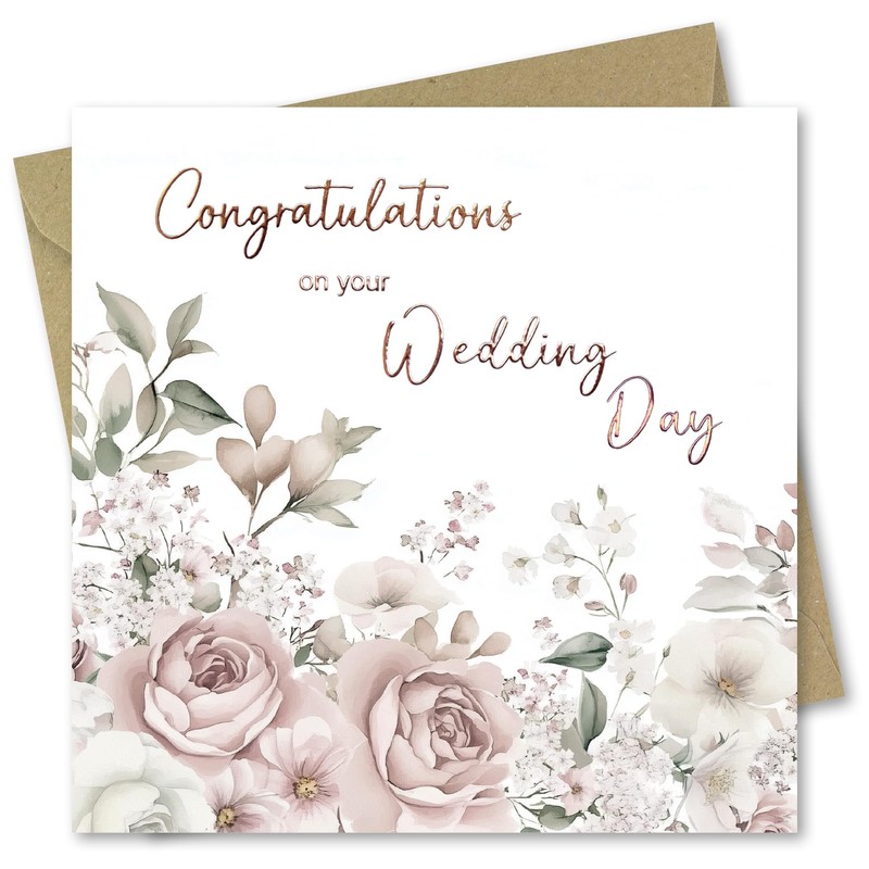 Wedding Card for bride and groom Congratulations on your Wedding Day. Floral Design with Rose Gold Foiled text. 150x50mm. Supplied with Kraft envelope.