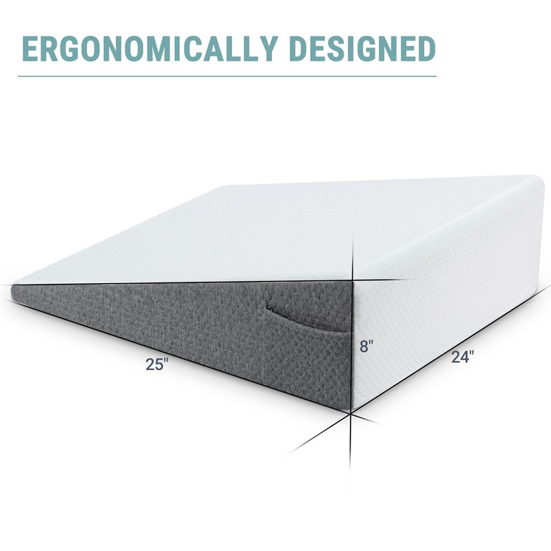 An elevated design keeps your airways open, helping you breathe and fall asleep through the night which can reduce breathing and snoring issues. By improving your body posture and supporting your upper back and shoulders, this bed wedge cushion may relieve you of pressure points and back and neck pain. Oversized to maximize comfort and fit your body's shape as best as possible, constructed with high-density memory foam offering you medium firm support for a comfortable restful experience.