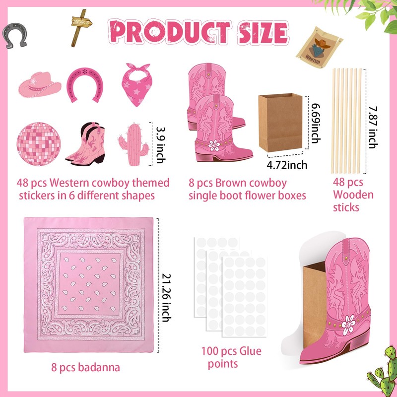 - Western Cowboy Themed Table Decorations: package includes 48 pcs western cowboy cutouts in 6 different shapes with the wooden sticks and glue points, 8 pink bandana, 8 thick enough kraft paper bags, 8 pairs of pink cowboy boots shaped cutouts with enough glue points and sticks, which are suitable for Wild west themed party, Bachelorette party, wedding, Bridal shower
