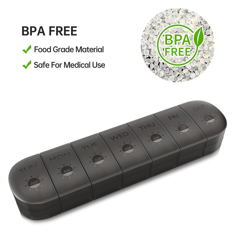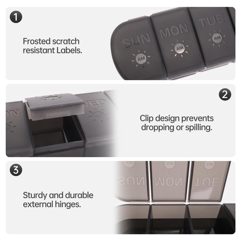 - 【Humanized and Elderly-friendly Details】 Tailor-made for the elderly! The larger opening for taking medicine can prevent spillage due to hand shaking, and the low-resistance sliding cover design can be easily opened and closed with one hand. The embossed weekdays and sun and moon patterns can be recognized by touch even with blurred vision. Details reduce the operating burden of the elderly and help them maintain their autonomy and dignity in taking medicine.