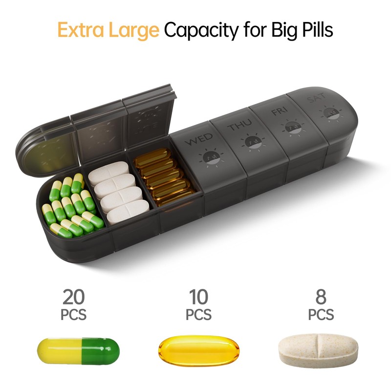 - 【Extra Large Capacity Pill Organizer】 Large capacity: Each pill box is large enough to hold 10 fish oil pills or 20 capsules to meet your weekly needs. Overall size: 8.66" x 2.08" x 1.37", single size: 1.81" x 1.18" x 0.55". You only need to spend 10 minutes a week to pack together, and you can say goodbye to the trouble of looking for medicine bottles and disassembling medicine boards every day. It is especially suitable for middle-aged and elderly people who need to take multiple medications, greatly improving the convenience of taking medication.