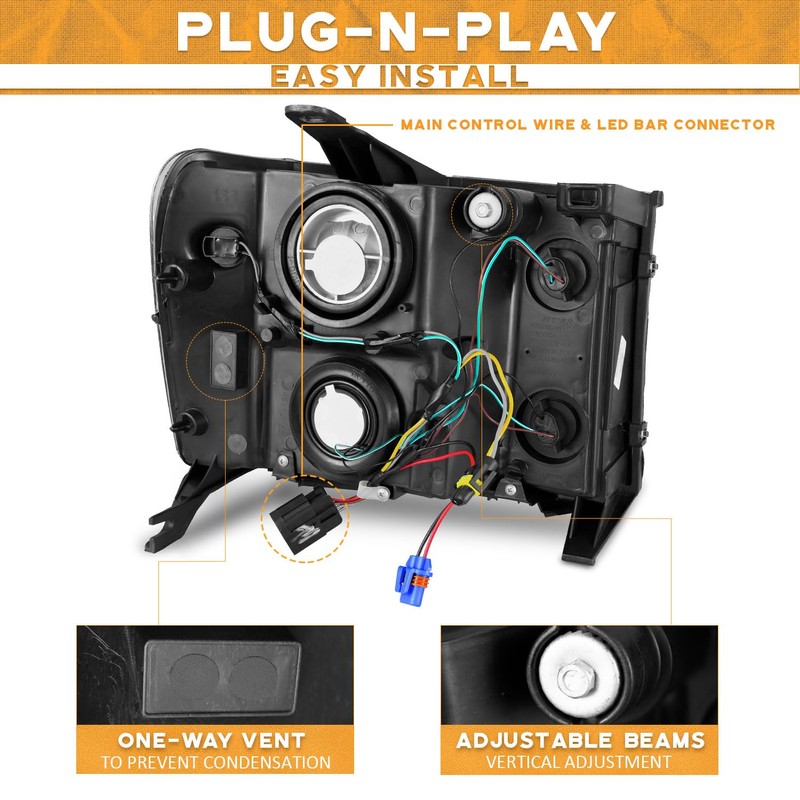 - Transform your vehicle with our cutting-edge LED bar replacement, perfectly designed for 2007-2013 GMC Sierra 1500 (Fit 2007 New Body Style only), 2007-2014 Sierra 2500 HD 3500 HD (Fit 2007 New Body Style & 2014 Old Body Style models only). (Note: High/low beam bulbs not included; compatible with stock bulbs.) It features built-in LED chip strips for easy installation and a modern aesthetic. Two Dynamic Lighting Modes: 1) Standard High/Low Beam; 2) Parking Light with Cool White LED Strips