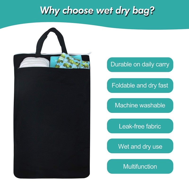• MACHINE WASHABLE - Tumble dry low, can last up to hundreds washes. Wet items must be fully wrung out before placed in the bag, excess water may cause leaks through the seams. We recommend purchasing two wet bags, so you can rotate them in the wash.