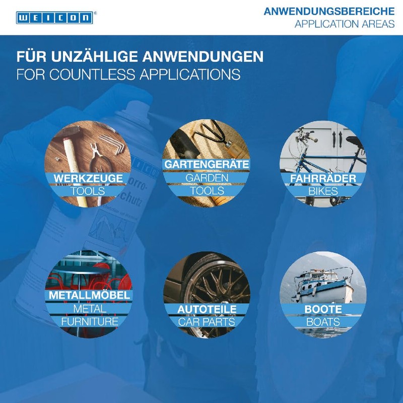 - Long-lasting - The preservative wax provides a durable protective film that protects against corrosion. If necessary, it can be quickly removed (with WEICON spray cleaner S).