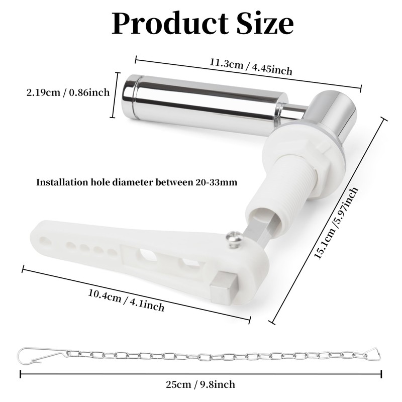 - 【Material】Toilet flush handle adopts chrome-plated surface treatment, and the main structure adopts zinc alloy. Strong and reliable, long service life.