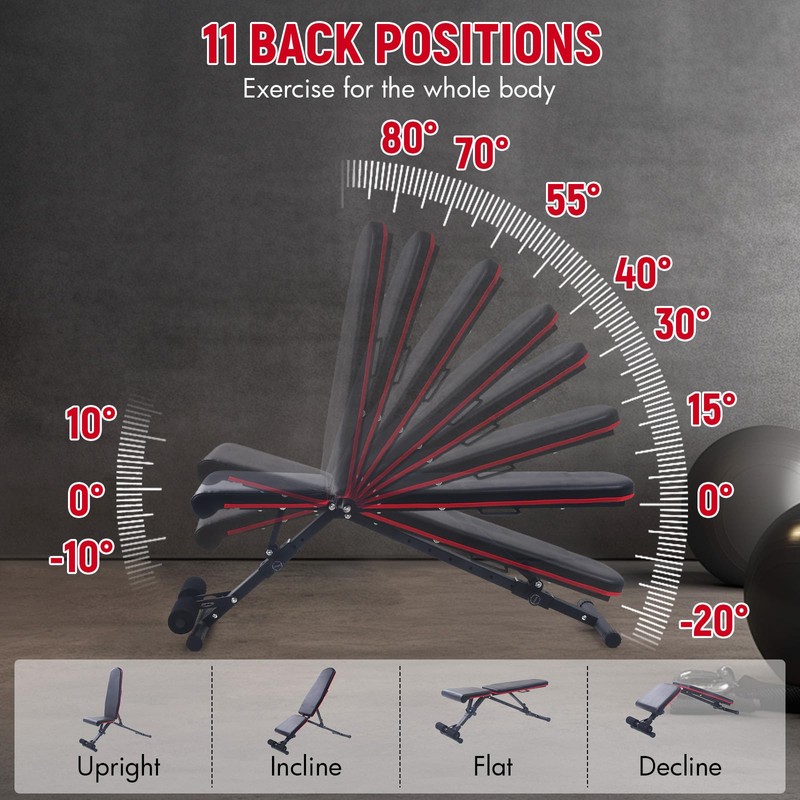- Quick and Easy Adjustments Angle: Our multipurpose strength training bench is designed with 8 back adjustments, 3 seat adjustments, making it easy to achieve incline benches, decline benches, and flat benches.This adjustable weight bench targets multiple muscle groups, including the chest, back, abs, arms, glutes, and shoulders, saving you time and money on trips to the gym