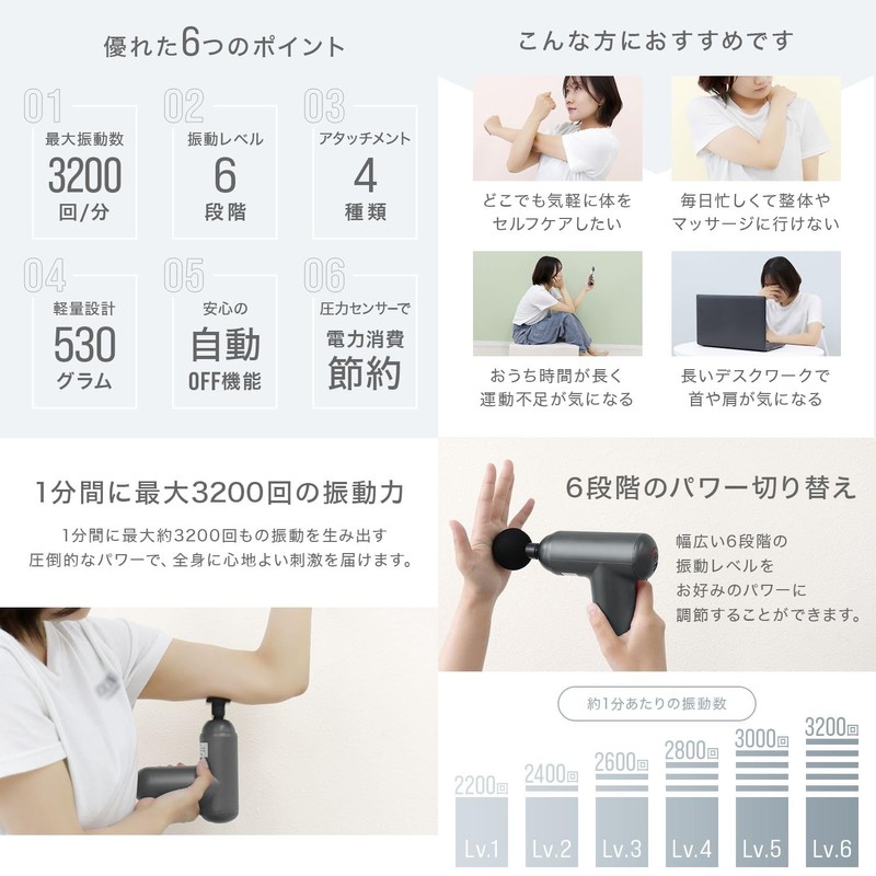 - 【ワンタッチ操作・6段階レベル調節】本体背面のボタンを押すだけで簡単にON/OFF/振動レベルの操作ができます。2200~3200回/分で6段階の振動レベル調整が可能です。圧力センサー付きでヘッドが身体に当たっていない間はゆっくり振動。消費電力を抑えることができます。 USB Type-Cの充電式なので、持ち運びも簡単。ご自宅はもちろん、ジム・職場などあらゆる場所でご使用いただけます。