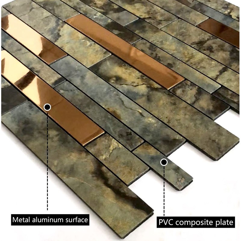 - 1. This mosaic is PVC mixed metal tiles. 3D marble texture,Its special design makes it more textured and layered. radiation free,color fadeless。