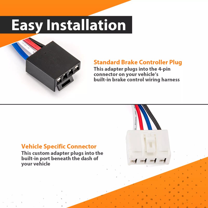 Easy installation, no cutting or splicing required, just plug the brake control end of the harness into the electric brake controller and the vehicle end into the built-in port under the vehicle dashboard.
