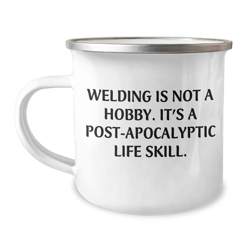 - Show your love for welding with this inspirational camping mug, perfect for Valentine's. The quote 'Welding Is Not A Hobby. It's A Post-apocalyptic Life Skill.' is a humorous and relatable way to express your passion for welding.