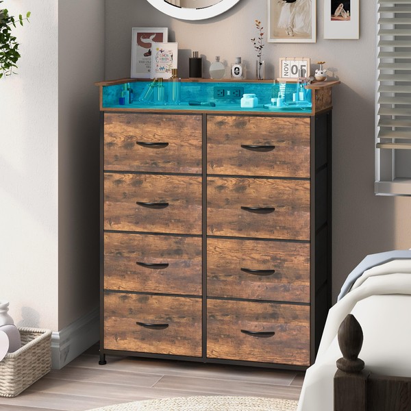 Welfuturer Tall Dresser for Bedroom with Charge Station 8 Drawers Dresser with LED Lights Chest Organizer Units for Hallway Entryway Closets Sturdy Steel Frame Wood Top Easy Pull Handle Rustic Brown