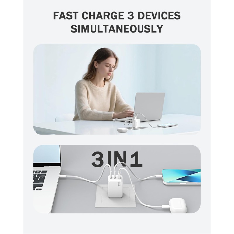 - Fast Charging for 3 Devices: Equipped with two USB-C ports and one USB-A port to power three devices simultaneously, connect a single device to charge up to 67W.