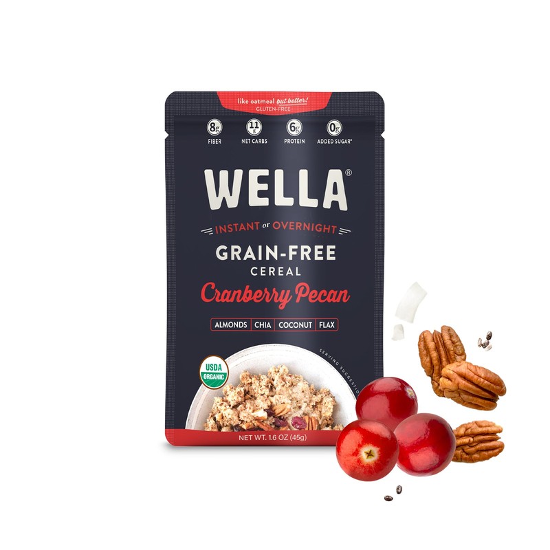 Wella Cereal Oatmeal Alternative, Gluten-Free Breakfast Hot Cereal, Grain-Free Paleo Organic Vegan High Protein Superfood, Plant-Based Non-GMO, Low in Net Carbs, Single-Serve Packets, Cranberry Pecan Flavor (5 Count, 1.6 oz. Packets)