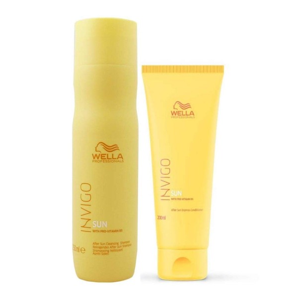 After Sun Shampoo This shampoo is ideal after a long sunbath. It has been specially developed for hair that is exposed to the sun and therefore UV rays. It cleans your hair and removes sand and salt residue. Enriched with provitamin B5, your hair is nourished at the same time. With sun blend. - Cleans – Frees from sand and salt residues – with Provitamin B5 – Sun Blend Application: Apply to wet hair and foam. Rinse thoroughly. The Wella Invigo After Sun Express Conditioner helps to regenerate sun-damaged hair immediately. The intensive conditioner has a deep, repairing immediate effect. It gives the hair an irresistibly healthy look and noticeable smoothness. With apricot oil. Use of Wella Invigo After Sun Express conditioner intensively massage in wet hair, leave to work for a short time and rinse thoroughly.
