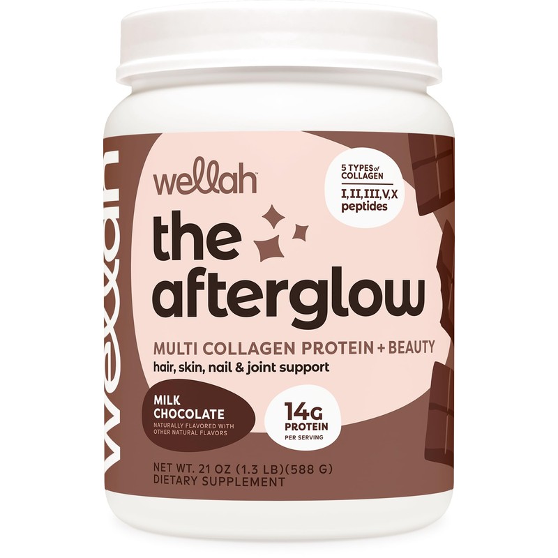 - Wellah's The Afterglow Multi Collagen Protein + Beauty comes in 3 flavor options: Unflavored, Chocolate & Orange Mango. With 30 servings per bottle, this Chocolate flavored Collagen will last for one month when taken as directed.