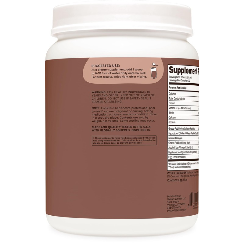 - Ingredients include: grass-fed bovine collagen peptides, hydrolyzed chicken collagen peptide (type 2), marine collagen, grass-fed beef bone broth, apple cider vinegar extract, hyaluronic acid, and egg shell membrane.