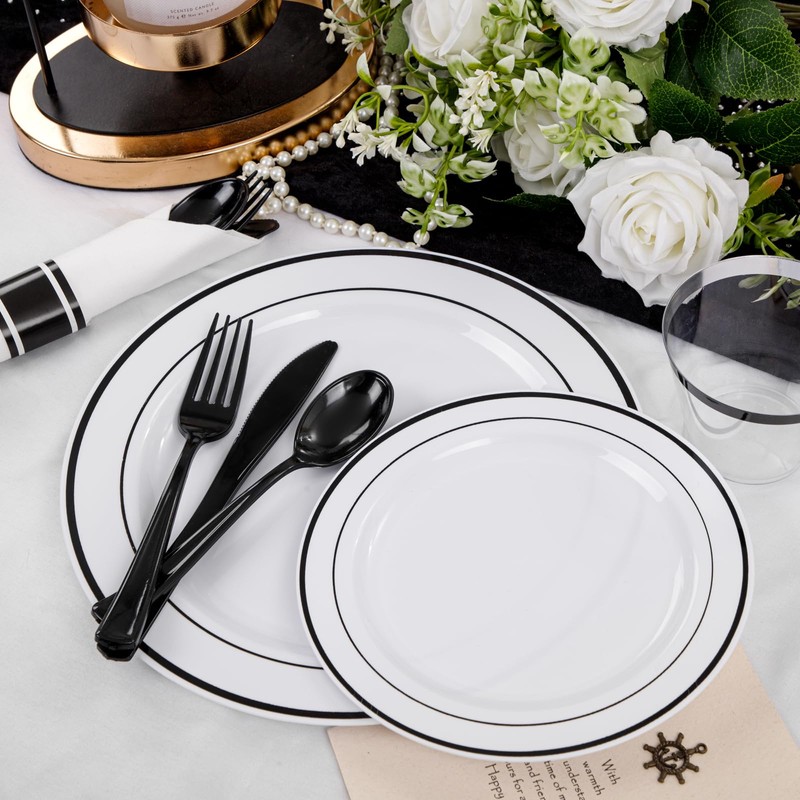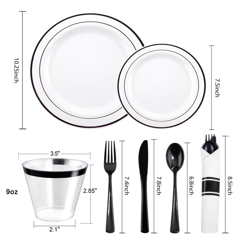 - All Occasions:Whether it's a family gathering, a party dinner or a business dinner, white and black plates are versatile enough for you to use on occasions, whether it's for fruits and salads or steak and fries, it's up to the task. The gold plastic cups in the set can be used to serve cookies, drinks, ice cream, and more.