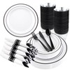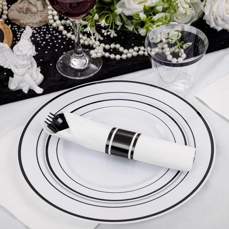 WELLIFE 350Pcs Black Plastic Dinnerware with Pre Rolled Napkins, Include:50 Dinner Plates, 50 Dessert Plates, 50 Paper Napkins, 50 Cups, 150 Plastic Cutlery