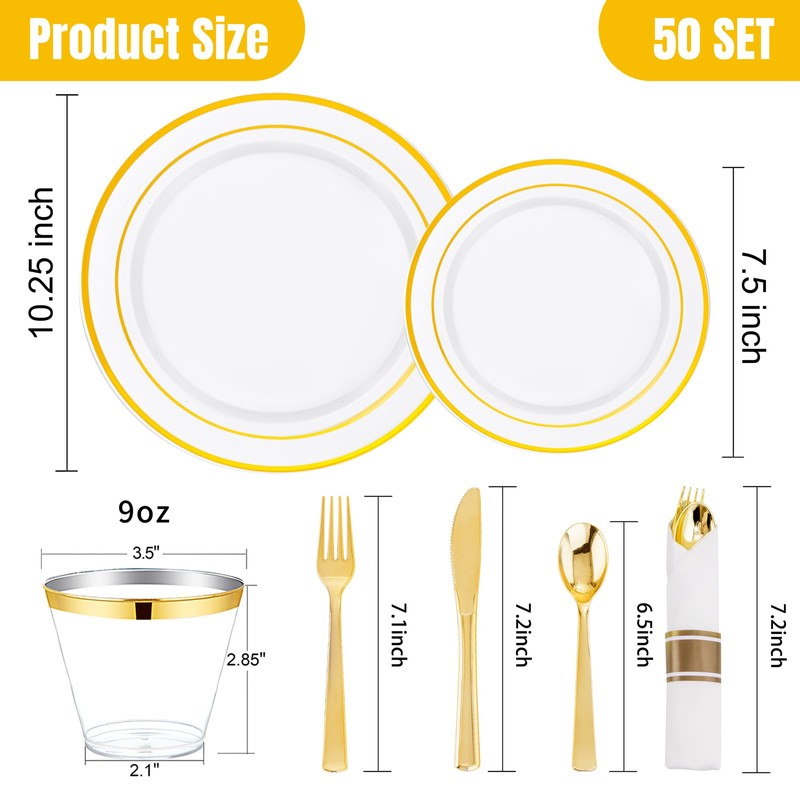 - WHAT YOU GETThese party plates and cups and napkins sets are very suitable for gatherings and can meet all the party needs of 50 guests. The set includes 50 dinner plates, 50 dessert plates, 50 gold - rimmed cups, and 50 sets of gold - colored silverware with pre - rolled napkins. If you invest in this set of party plates, it will be your perfect choice.