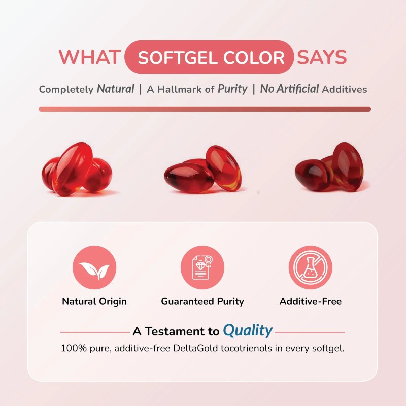 - Color Deviation : Softgel color variation is natural and reflects the pure, additive-free DeltaGold tocotrienols sourced from annatto plant, influenced by soil, location, weather, and harvest conditions.