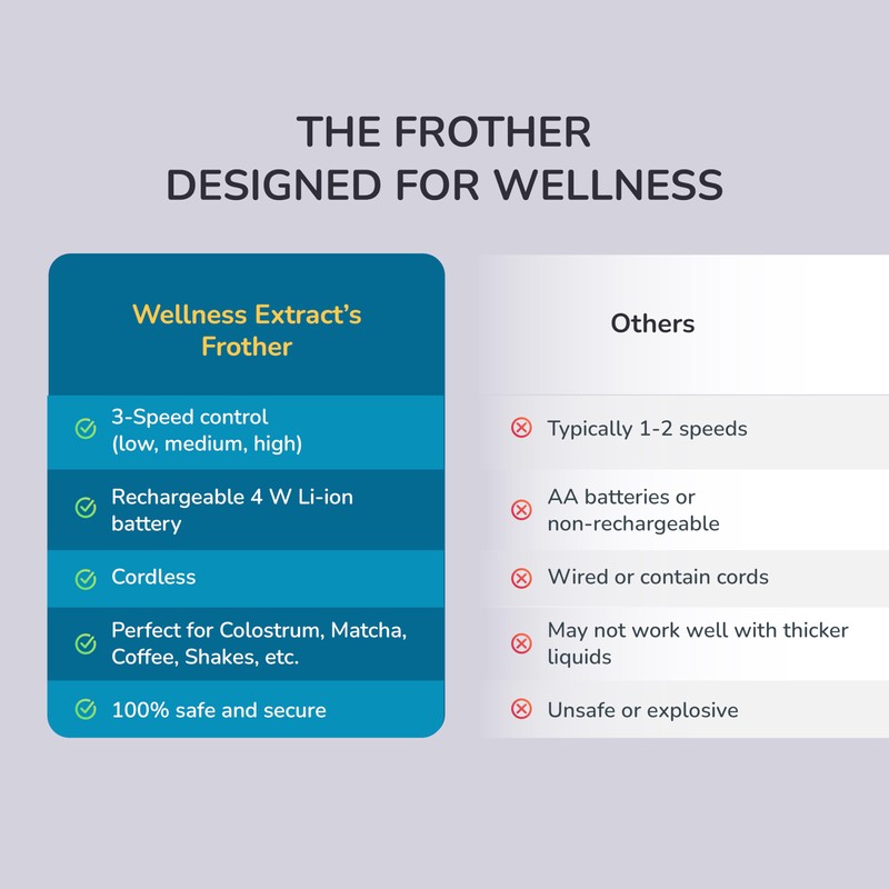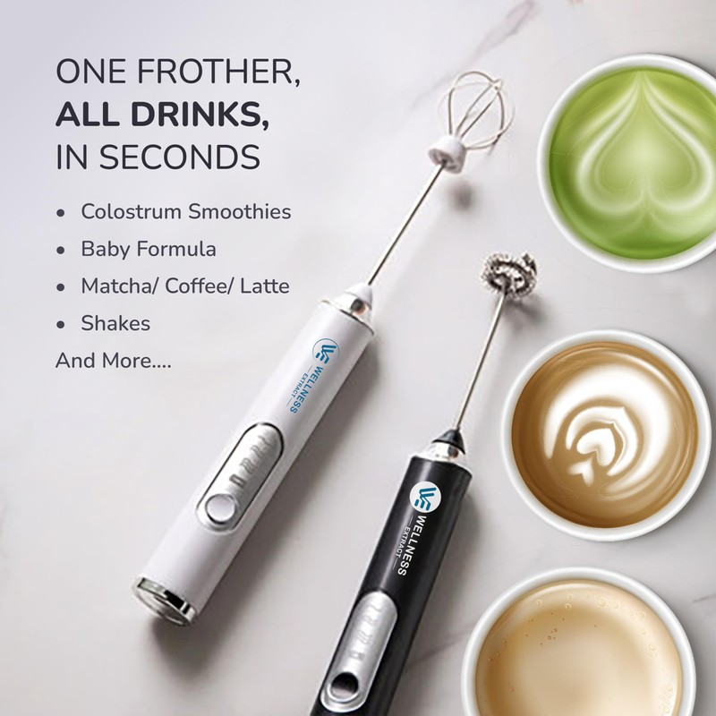 • One Frother, Many Uses: Designed for Wellness Extract's Bovine Colostrum, this milk frother is versatile and multifunctional. Use it the way you want. Your morning protein drinks, evening matcha, greens powder, classic coffee brew, DIY healthy smoothies, and, of course, clump-free Bovine Colostrum.