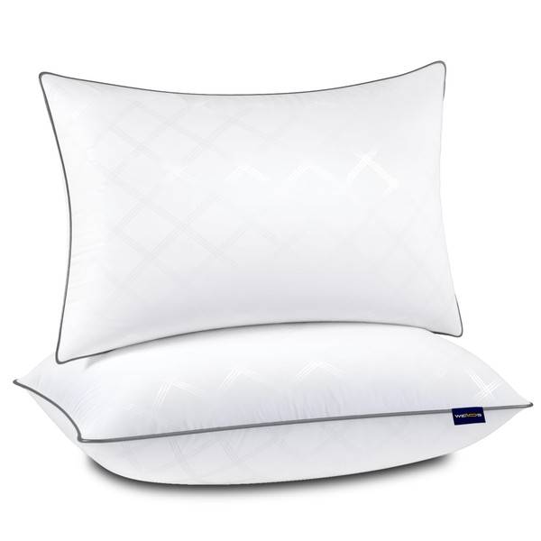 - SOFT & BREATHABLE: Wellos 2 Pack Queen Pillows feature a breathable and skin-friendly cover, ensuring a 5-star hotel like feeling. The exquisite checked pattern and premium grey piping design combines comfort and beauty. These bed pillows offer a marshmallow-like softness and cloud-like sleeping experience.