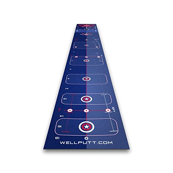 • AIMING AND SPEED CONTROL TRAINING: Show your patriotism during this golf season with the 13-feet Limited Edition Stars and Stripes Wellputt Golf Mat. It’s conceived to allow players to putt in both directions - you will improve your accuracy in one direction and ensure proper ball speed in the other one. The golf alignment aids on the mat make it effortless to line up your putt, the stroke amplitude guides allow you to practice distance control. 2 speeds according to the play direction.