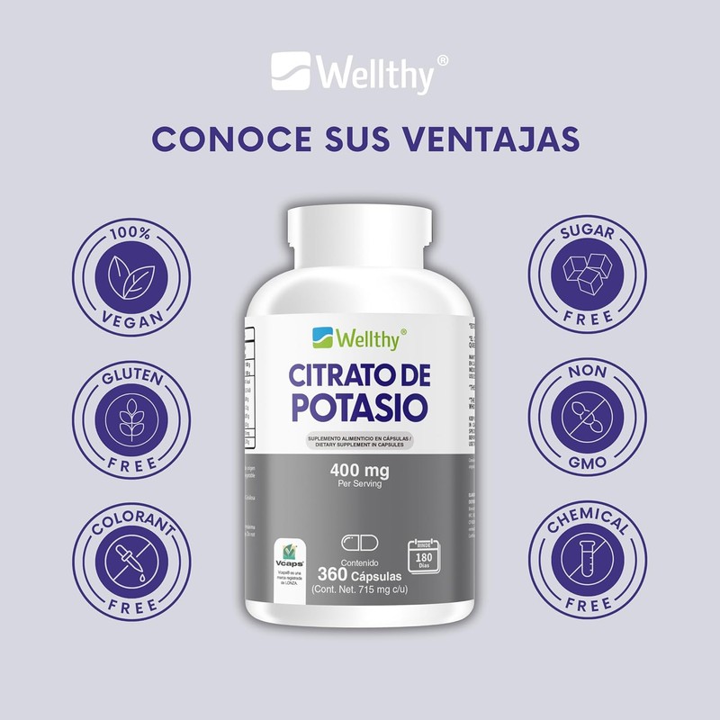 Wellthy Citrato de Potasio 360 Cápsulas 400mg. 180 Porciones por Envase para ...