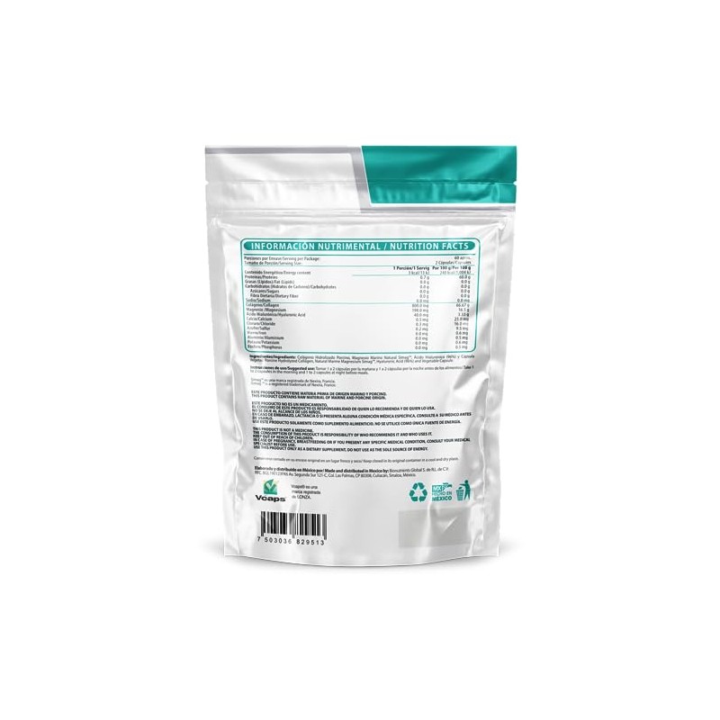 - Colageno con magnesio: Magnesio Marino Simag de patente Francesa. Extraído del mar mediterraneo en Israel con procesos 100% Naturales