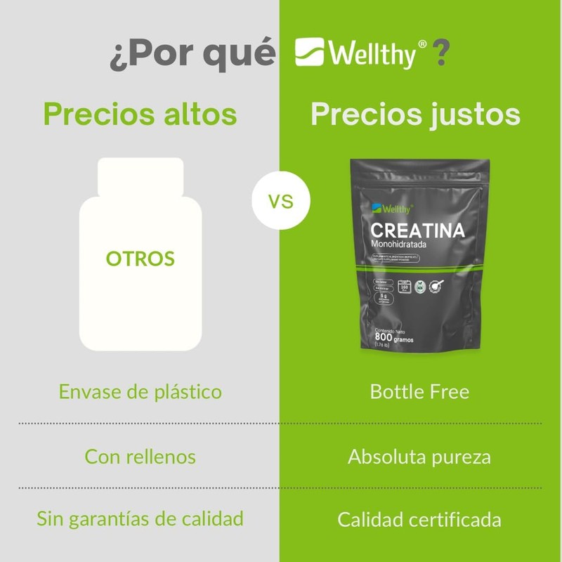 Wellthy Creatina Monohidratada de alta pureza, un suplemento en polvo que ofrece 800g de creatina 100% pura y natural. Cada porción proporciona 5g de creatina monohidratada, permitiendo una dosificación precisa y adaptable para integrar fácilmente en tu rutina diaria. Este producto es completamente libre de azúcar, sin sabor y sin olor, lo que facilita su mezcla con cualquier bebida o batido sin alterar su sabor original, brindando versatilidad en su consumo. Incluye una cuchara medidora dentro del empaque para asegurar una medición exacta en cada uso, promoviendo la consistencia en tu suplementación. Wellthy se compromete con el medio ambiente al presentar este suplemento en un empaque bottle free, reduciendo el uso de plástico y promoviendo prácticas de consumo más sostenibles. Al elegir Wellthy Creatina Monohidratada, optas por un producto de alta calidad y pureza, diseñado para aquellos que valoran la eficiencia y la responsabilidad ambiental en sus suplementos deportivos. Este enfoque combina practicidad y compromiso ecológico, ofreciendo una opción consciente para integrar en tu rutina diaria.