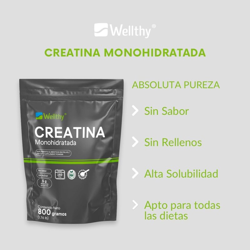 Wellthy Creatina Monohidrata 800g. 100% Pura, Sin Sabor, Sin Azúcar, 5g de Creatina por porción, 160 días de Consumo, Scoop Incluído, Bottle Free.
